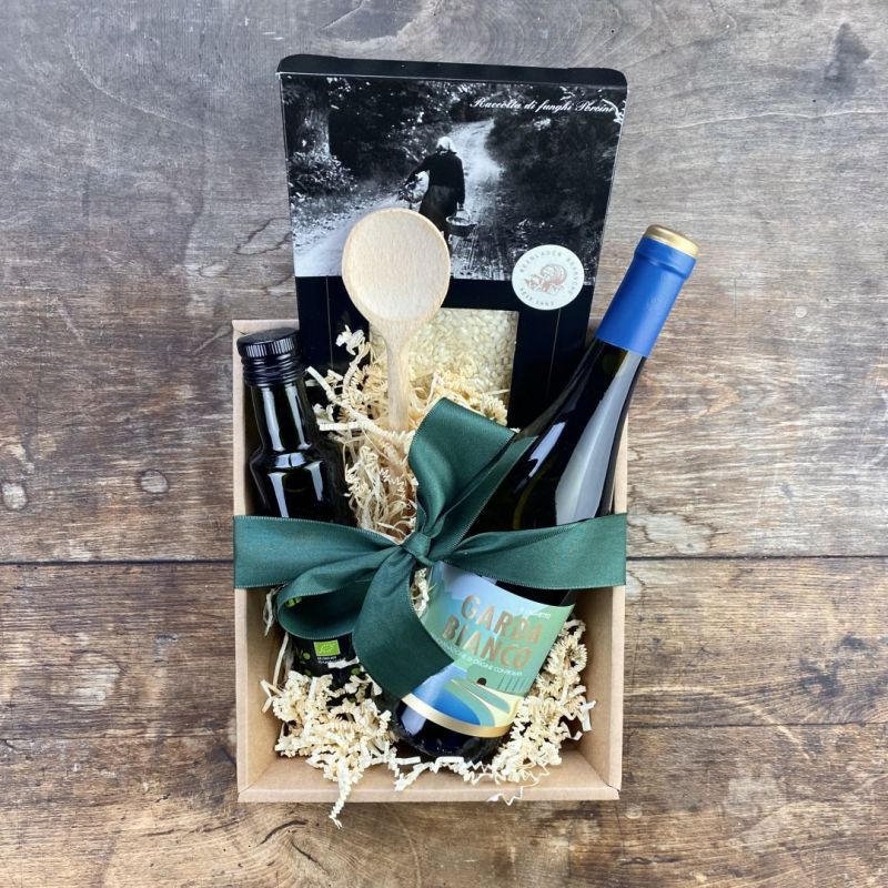 Präsentschale mit 0,75 l Garda Bianco, 0,25 l Olivenöl, Steinpilzrisotto und Kochlöffel.