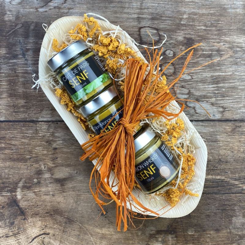 Wähle aus einer großen Auswahl verschiedener Senfsorten - von teuflisch scharf bis verführerisch süß in der Bambusschale.