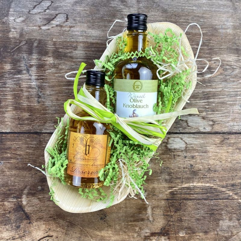 1 Flasche Balsamico Bianco 0,25 l und 1 Flasche Würzöl 0,25 l Olive Knoblauch in der Bambusschale.