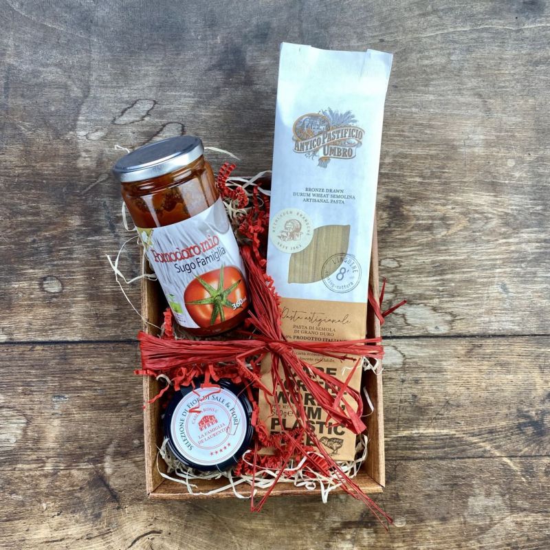 Linguine aus der Bronzeform, Sugo Pomodoro und Kräutersalz im Präsentkarton.