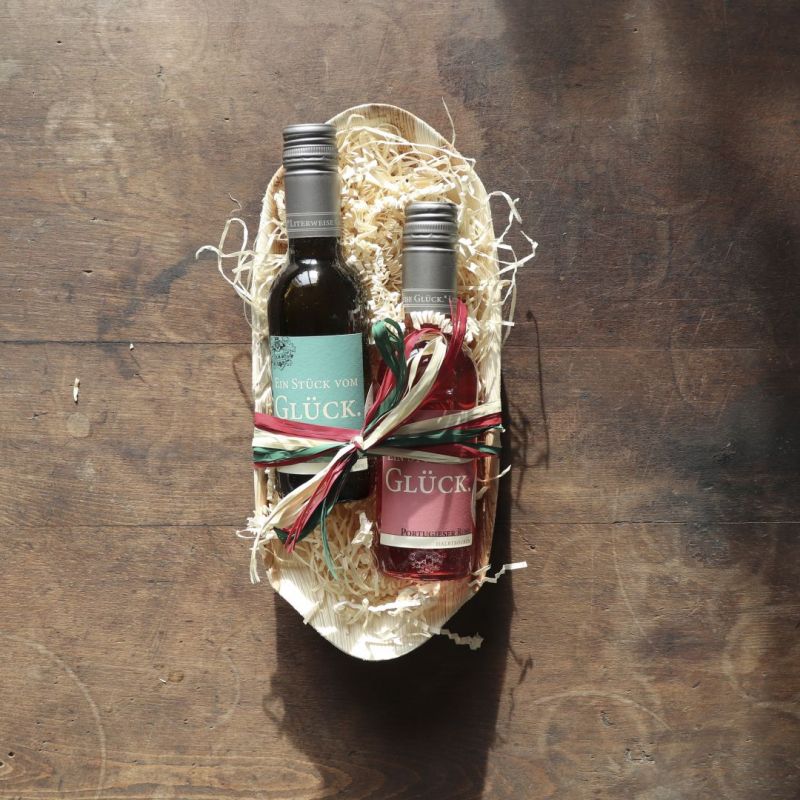 "Ein Stück vom Glück" Weißwein und Rosé 0,25 l in halbtrocken als Überreichpräsent in der Bambusschale.