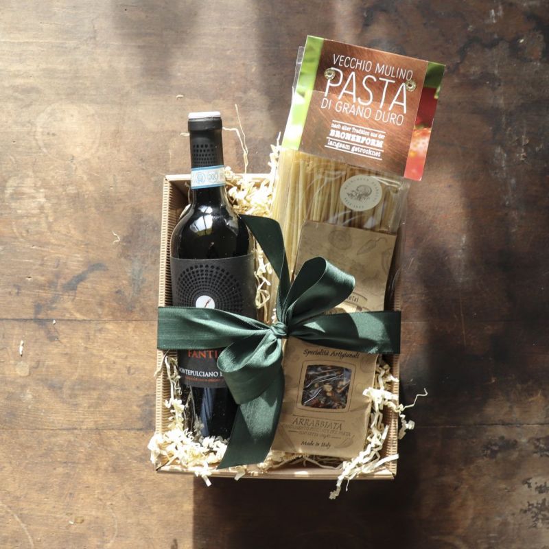 500 g Spaghetti aus der Bronzeform mit passender Kräutermischung 100 g und 1 Flasche Rotwein Montepulciano d'Abruzzo, trocken, fruchtig, weich im Präsentkarton.